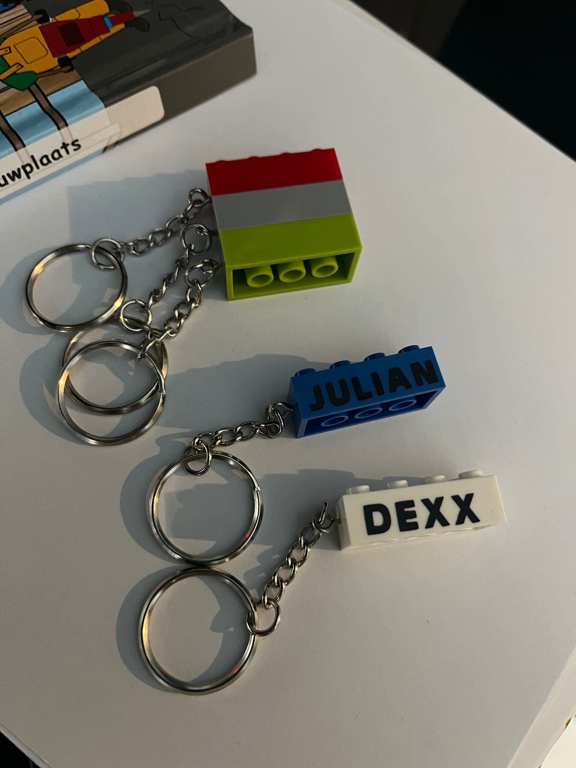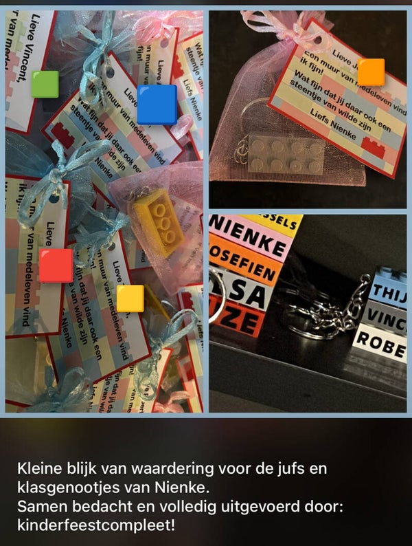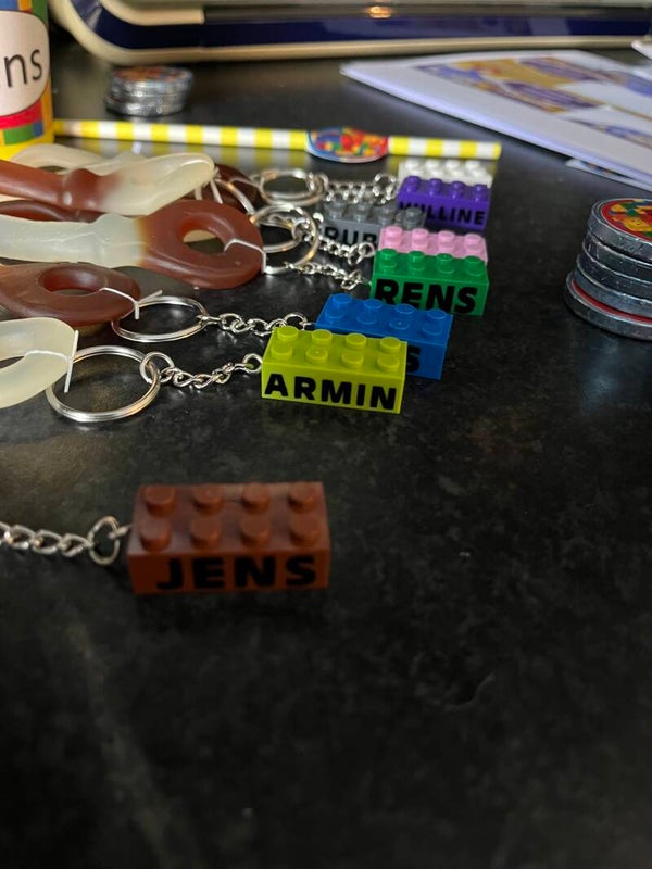 Gepersonaliseerde lego sleutelhanger. Leuk om op te trakteren, mee te geven na een lego feestje of afscheid/ bedankje